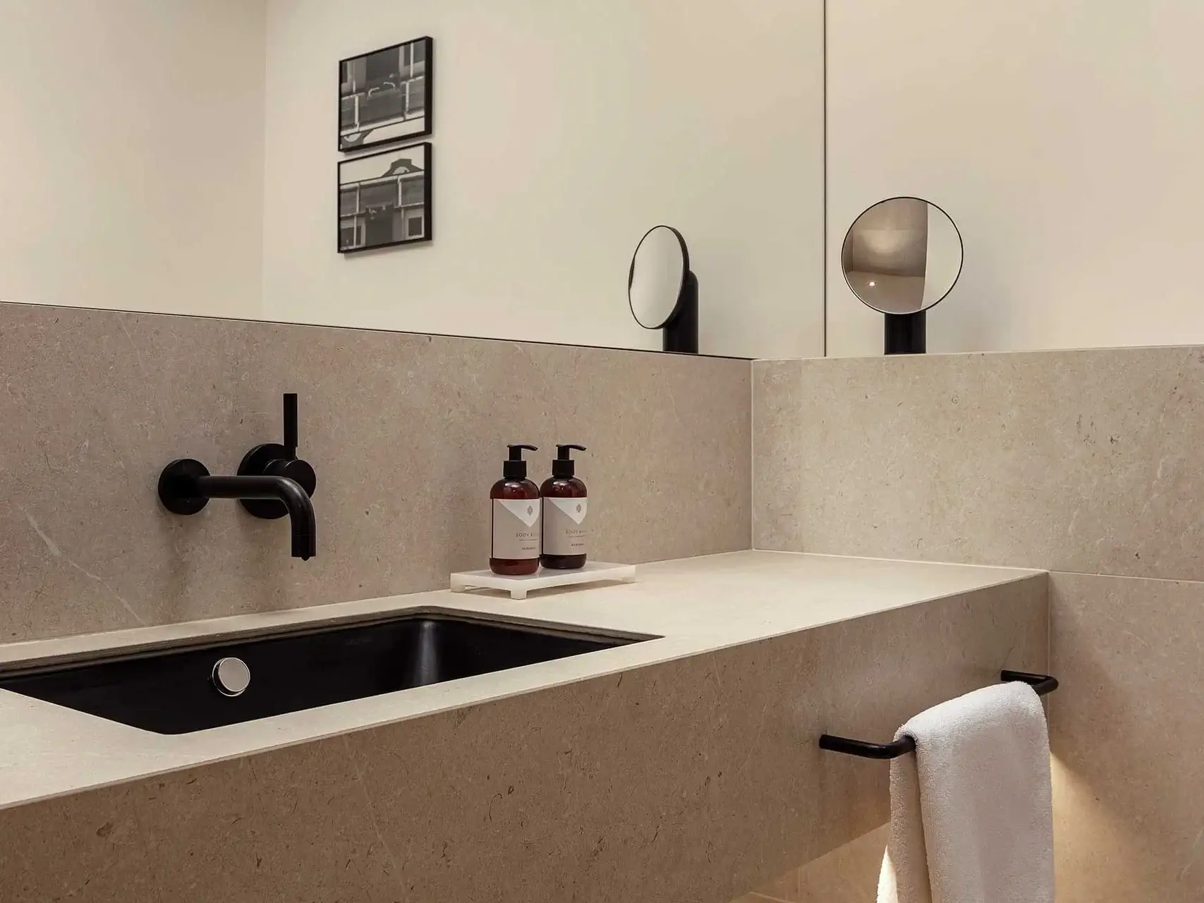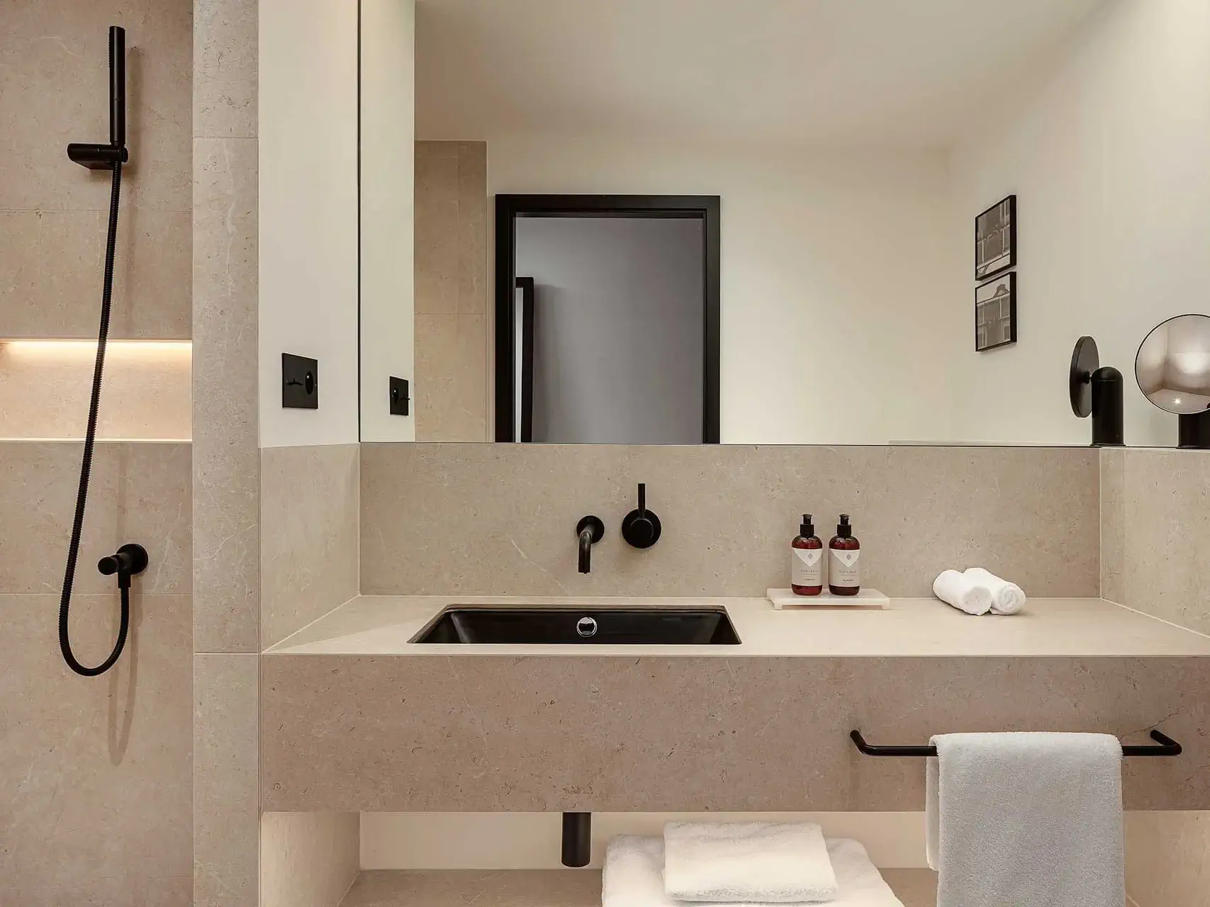 - Ibizan marble bathroom with a rainfall effect shower.