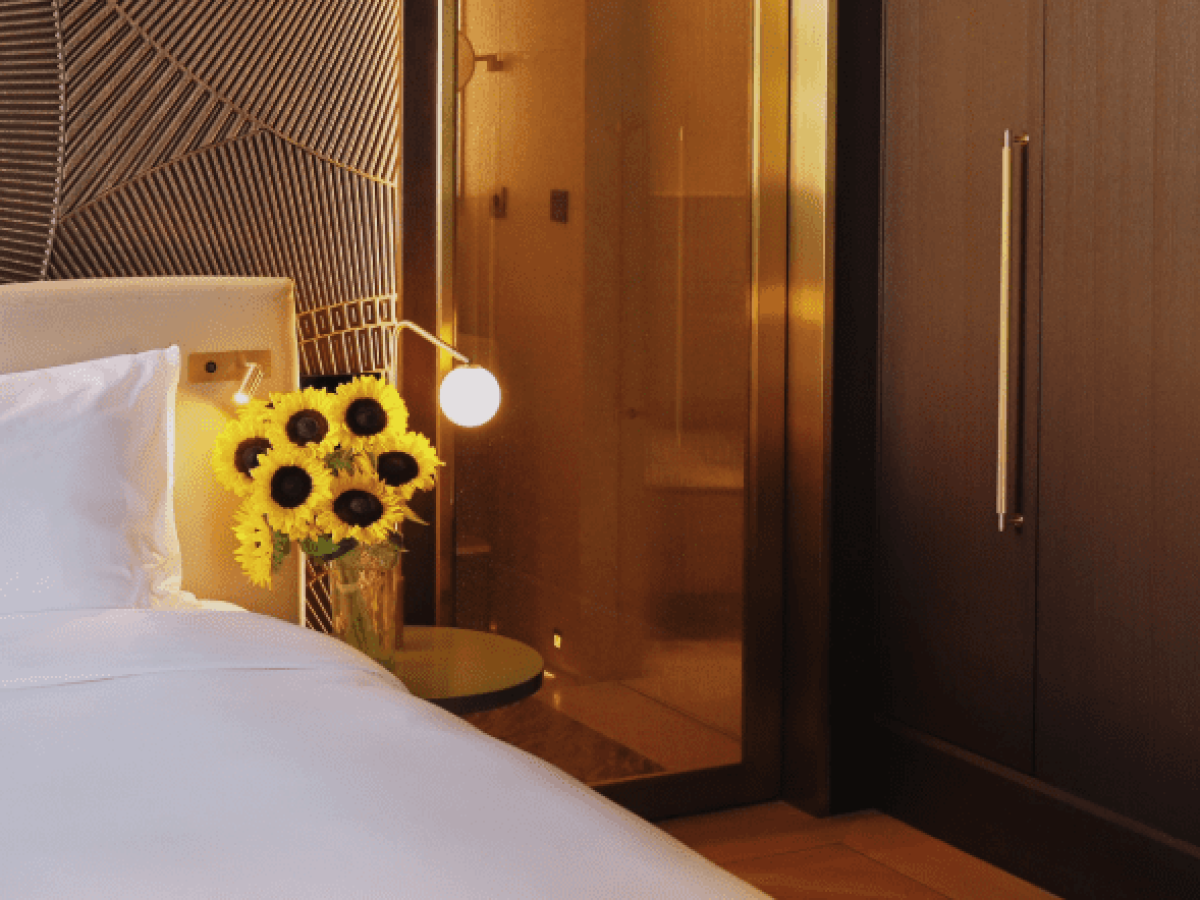 • A warm and modern room featuring a golden rainfall shower at your disposal.